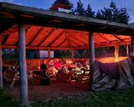 Stort bålhus, til at arbejde og spise i, shelter til overnatning, bænkebord sæt under åben himmel, alm. toilet med kold og varm vand, Wi-fi og strøm og masser af plads til at boltre os.